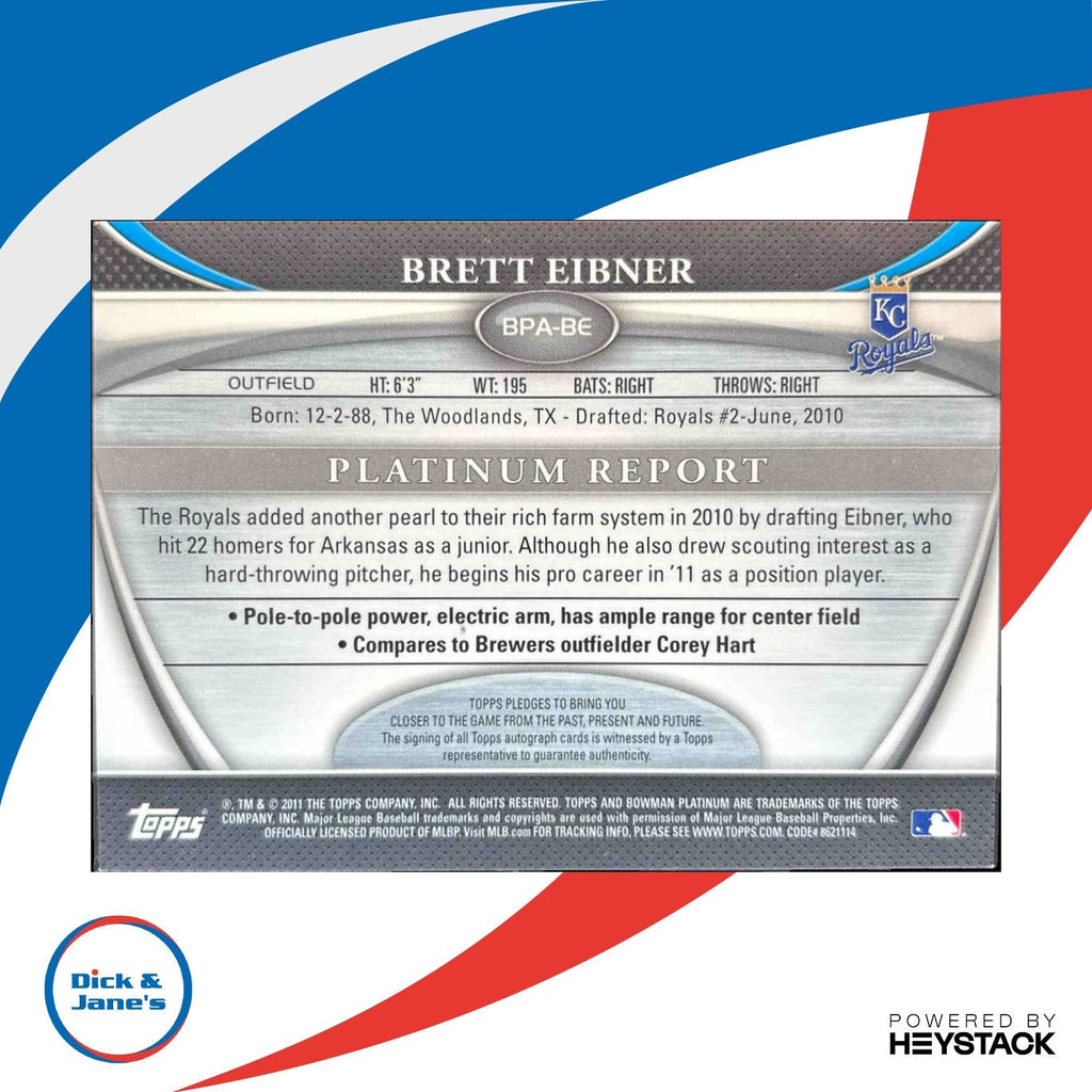 This 2011 Bowman Platinum Brett Eibner Prospect Auto Refractor trading card features a signature from the Kansas City Royals player. A must-have for any baseball card collector, this rare card captures a moment in Eibner's career as a promising prospect. Own a piece of MLB history today! Listed With Mascot.