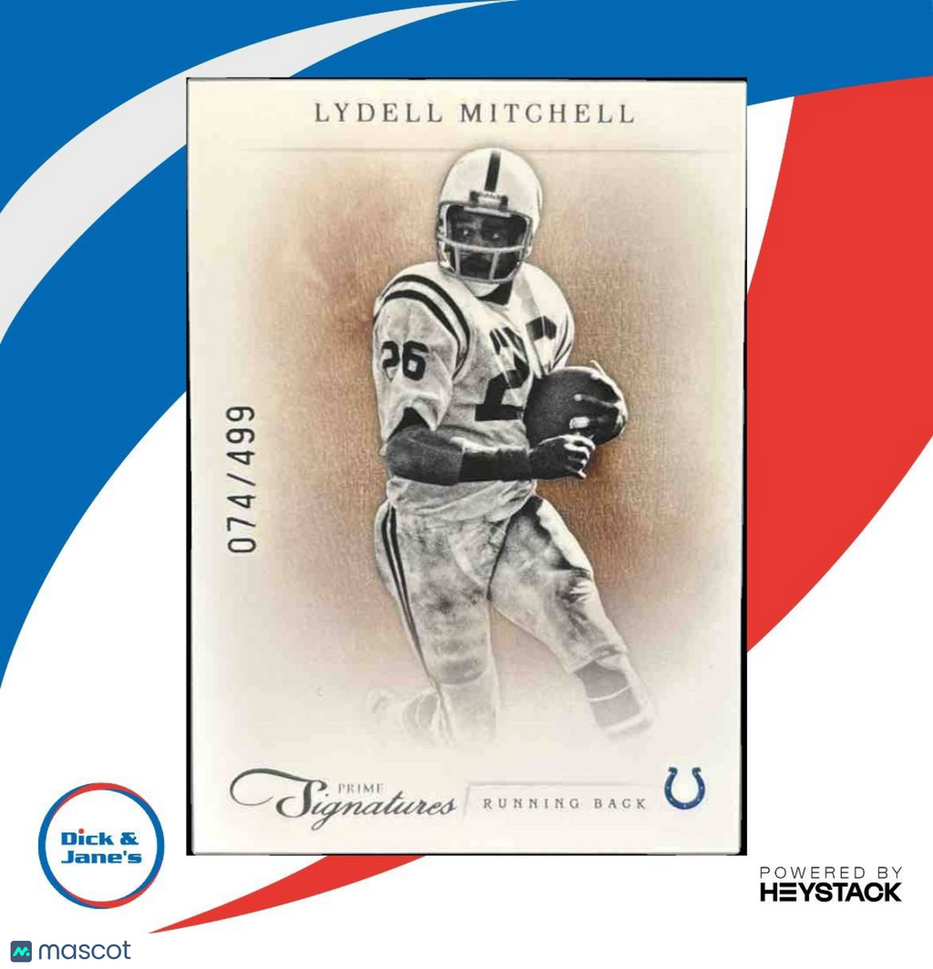 This 2011 Panini Prime Signatures sports trading card features Lydell Mitchell, numbered out of 499. The card includes an authentic autograph from the player himself, making it a rare and valuable addition to any sports memorabilia collection. Don't miss out on this unique piece of football history! Listed With Mascot.