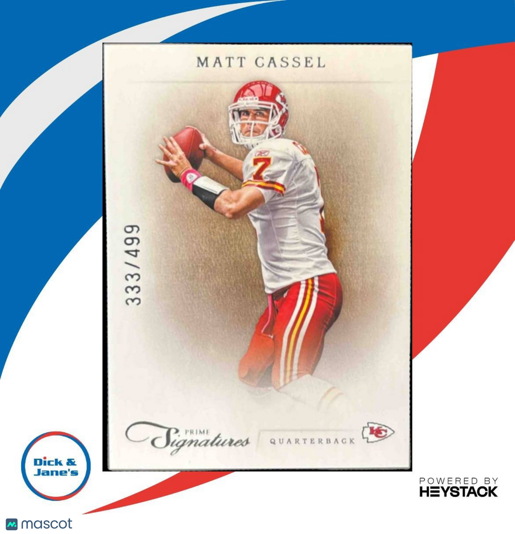 This rare 2011 Panini Prime Signatures Matt Cassel Proof Red trading card features the quarterback for the Kansas City Chiefs. Limited to only 99 copies, this card is a must-have for any NFL collector. Don't miss out on the chance to own a piece of football history! Listed With Mascot.