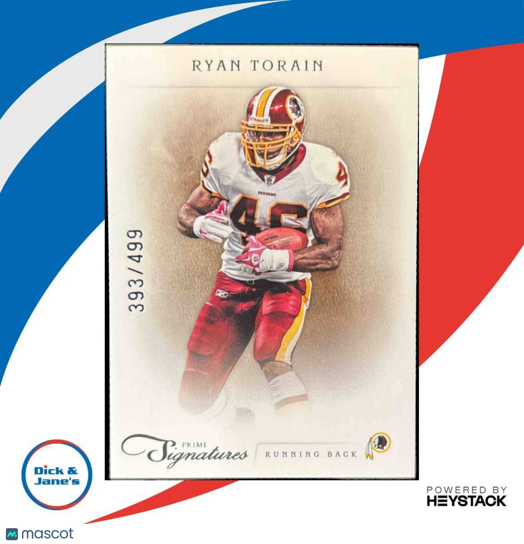 This 2011 Panini Prime Signatures Ryan Torain Proof Red card is a rare find for Washington Redskins fans. Limited to only 99 copies, it's a must-have for collectors. Grab this NFL trading card featuring the talented running back before it's gone! Listed With Mascot.