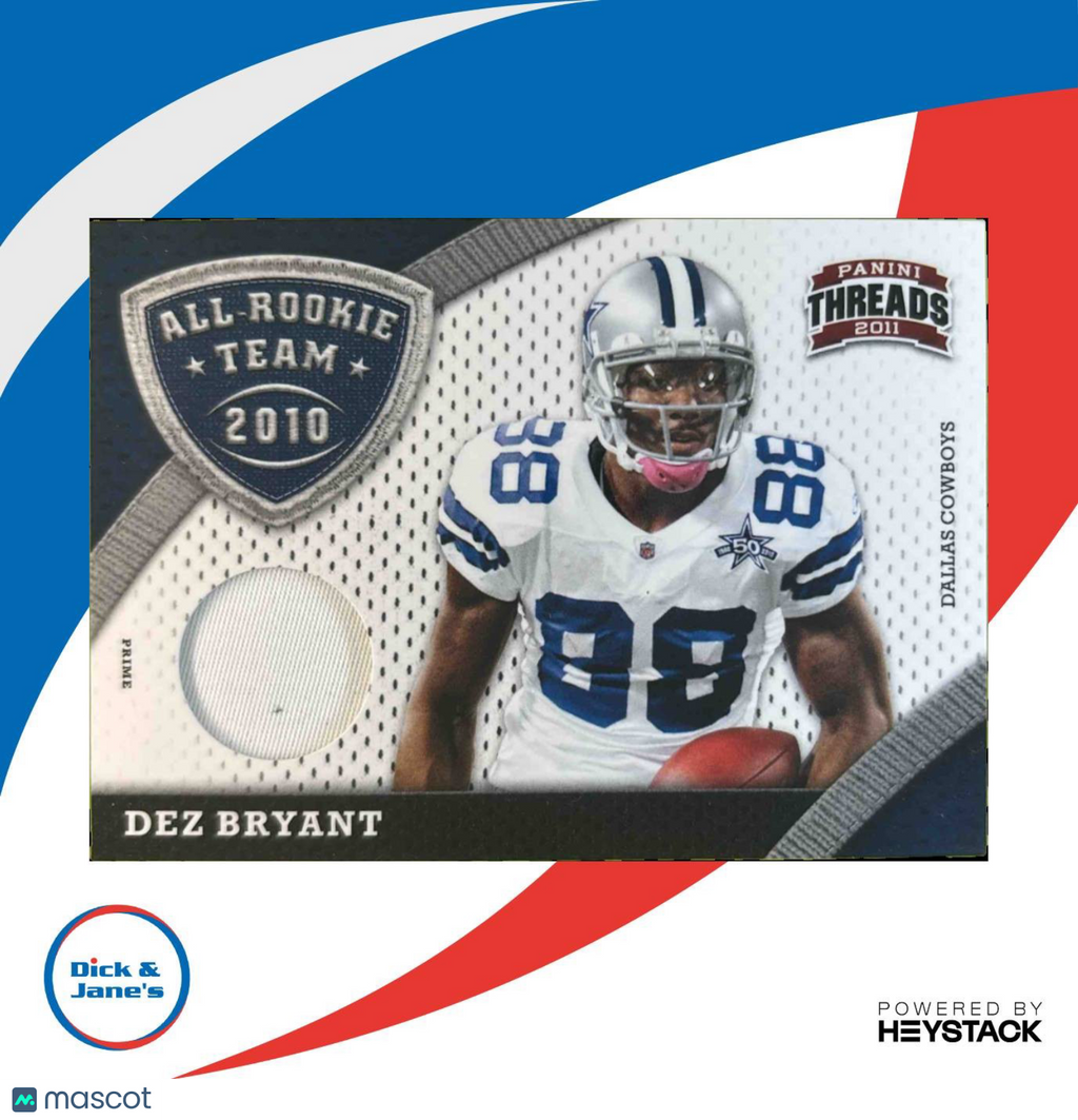 This 2011 Panini Threads Dez Bryant NFL trading card features the Dallas Cowboys wide receiver and 2010 All Rookie Team member in a prime edition, limited to only 99 copies. A must-have for any football card collector or Dez Bryant fan. Get it now before it's gone! Listed With Mascot.