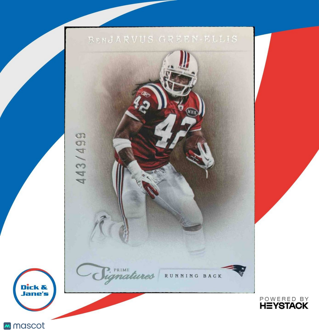 This 2012 Panini Prime Signatures BenJarvus Green-Ellis card features the Cincinnati Bengals running back in a limited edition run of only 499. A must-have for any NFL collector, this card showcases Green-Ellis in action and is a rare find for fans of the Bengals or football memorabilia enthusiasts. Don't miss out on adding this special card to your collection! Listed With Mascot.