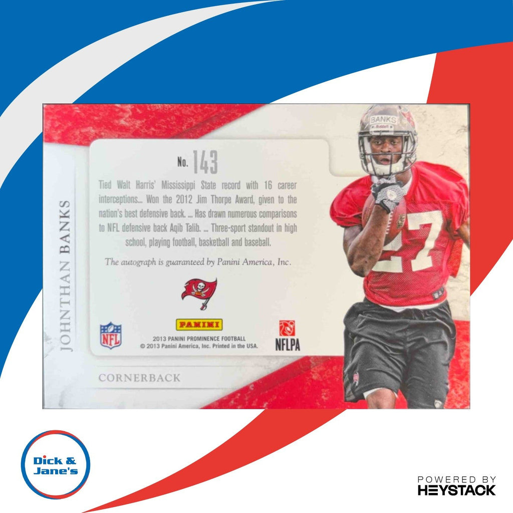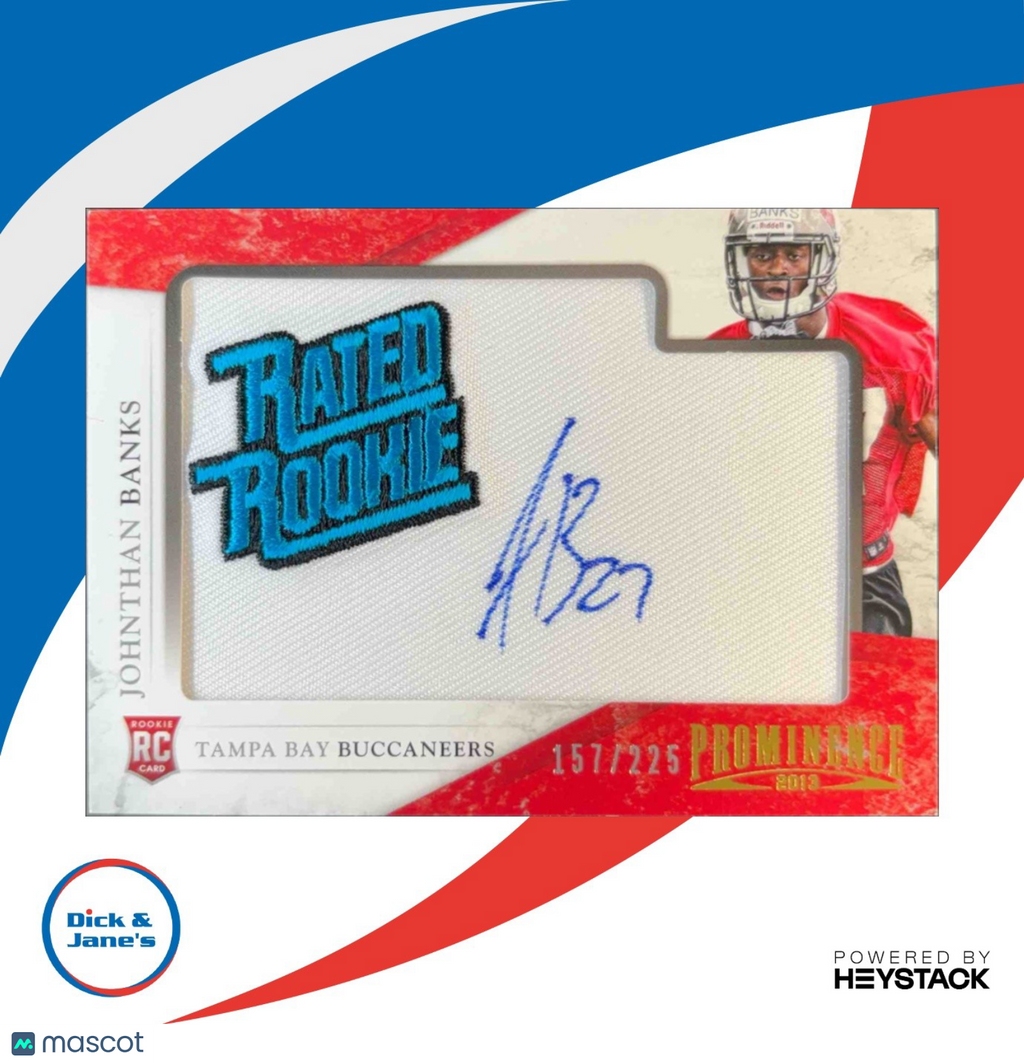: Own a piece of football history with this 2013 Prominence Johnthan Banks Rookie Rated Patch Auto /225 #143 RC Buccaneers trading card. Featuring a rare rookie signature patch and limited edition number, this card is a must-have for any NFL memorabilia collector. Don't miss out on adding this unique item to your collection! Listed With Mascot.