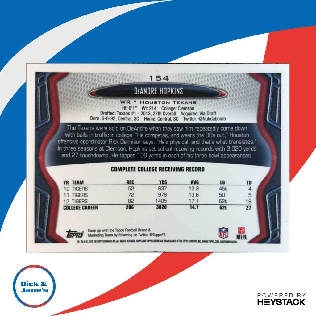 This 2013 Topps Chrome DeAndre Hopkins #154a RC Houston Texans trading card is a must-have for any NFL fan or collector. This rookie card features the talented wide receiver in his early days with the Texans. Don't miss your chance to own a piece of football history! Listed With Mascot.
