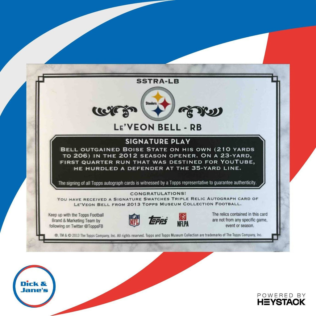 Own a piece of history with this rare 2013 Topps Museum Collection Le'Veon Bell Signature Triple Gold card. Limited to just 25 copies, this NFL trading card features an authentic rookie card autograph from the Pittsburgh Steelers running back. A must-have for any collector or fan! #NFL #LeVeonBell #Steelers Listed With Mascot.