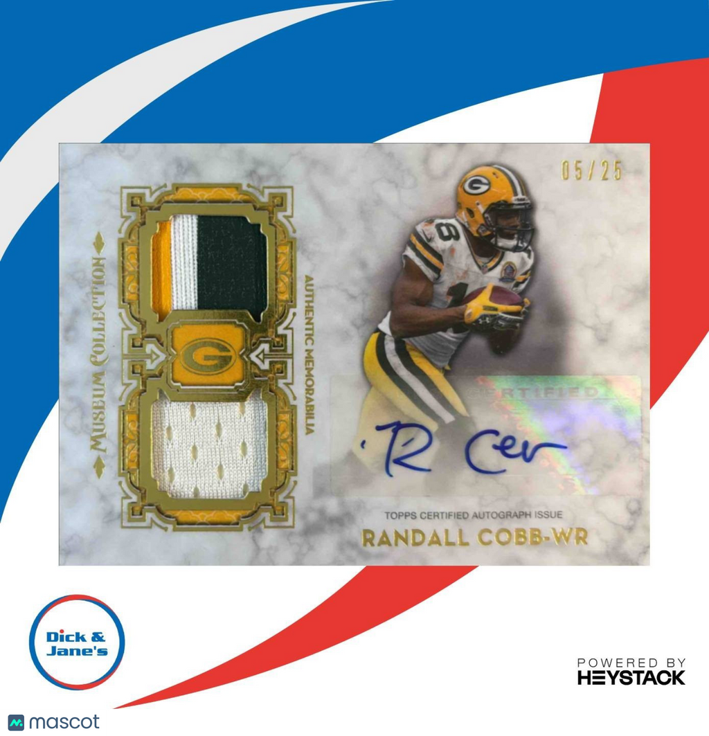 2013 Topps Museum Collection Randall Cobb AUTO Swatches Dual Gold /25 Packers NFL trading card. Features an autograph and jersey relic from the Green Bay Packers star wide receiver. Limited edition card with only 25 produced. A must-have for any football card collector! Listed With Mascot.