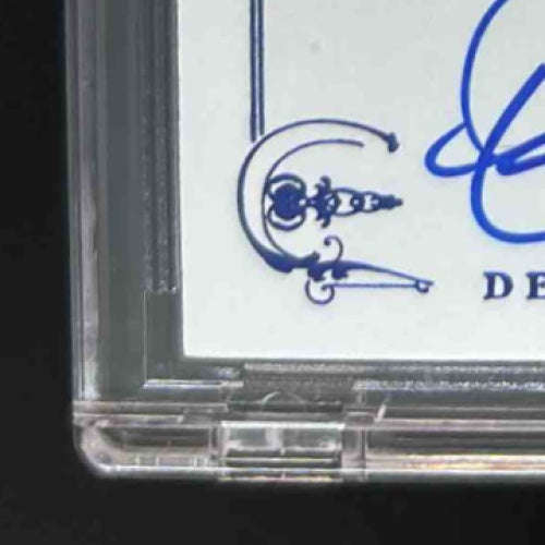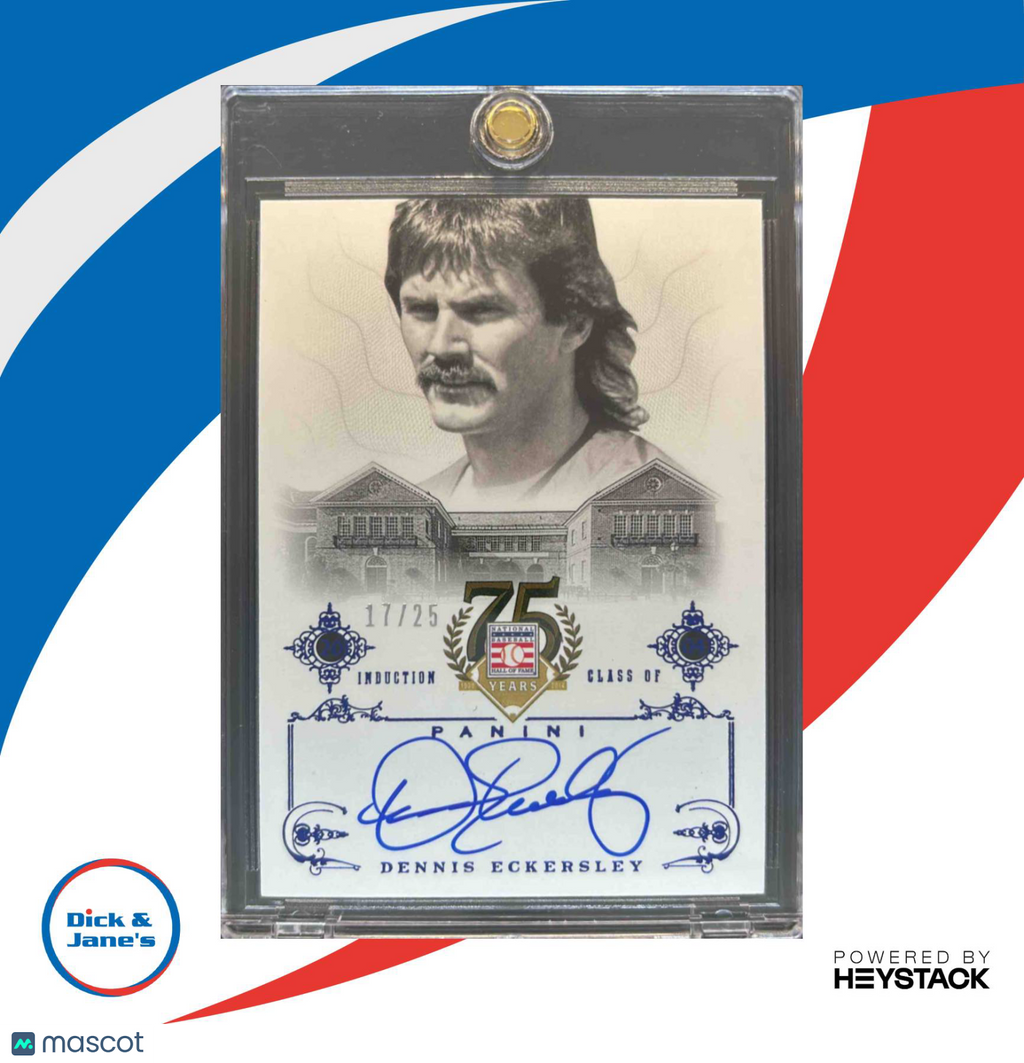This rare 2014 Panini Hall of Fame 75th Dennis Eckersley Signatures Blue /25 #16 Auto A's trading card features a hand-signed autograph from the MLB legend himself. Limited to only 25 copies, this highly collectible card is a must-have for any baseball fan or trading card enthusiast. Don't miss your chance to own a piece of baseball history! Listed With Mascot.