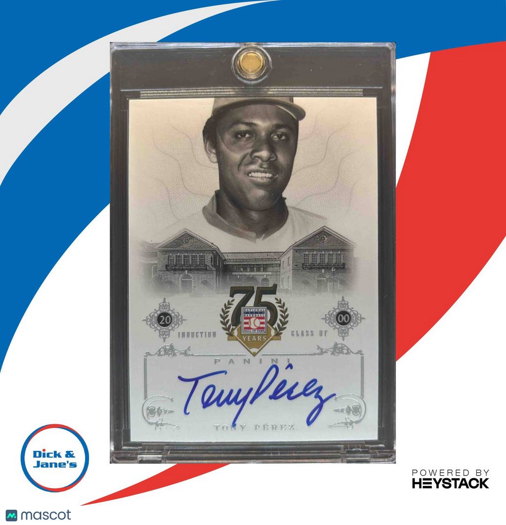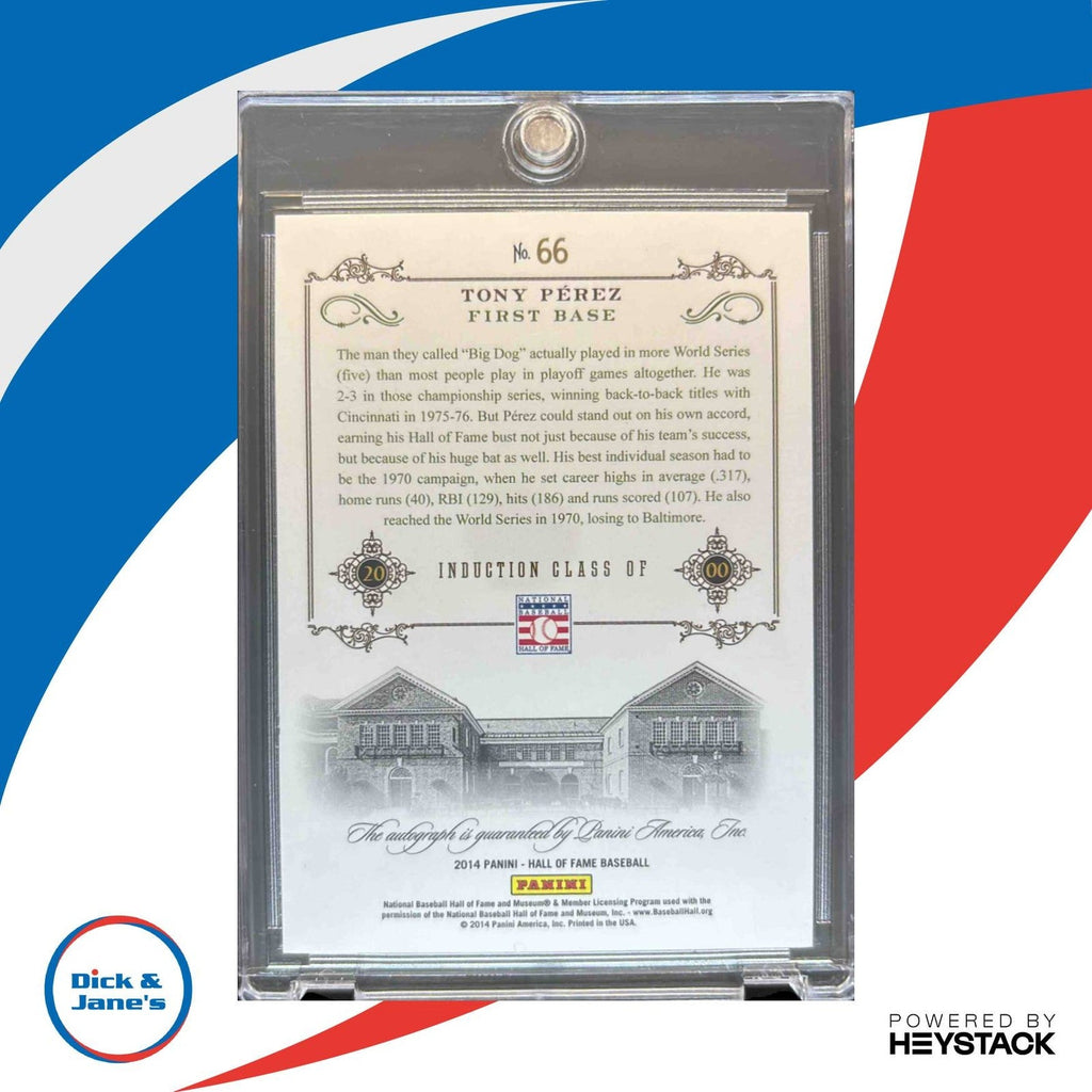 This limited edition 2014 Panini Hall of Fame 75th Tony Perez Signatures #66 Auto trading card features the iconic player's signature from the Cincinnati Reds. A must-have for any baseball fan or collector looking to add a piece of MLB history to their collection. Don't miss out on this rare find! Listed With Mascot.