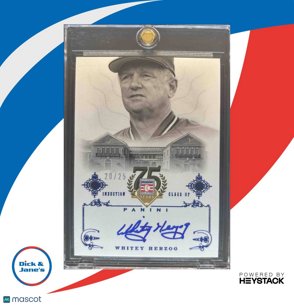 Own a piece of baseball history with this rare 2014 Panini Hall of Fame 75th Whitey Herzog Signatures Blue/25 69 Auto Cardinals trading card. Featuring a limited edition autograph from the legendary Whitey Herzog, this card is a must-have for any serious collector. Don't miss your chance to add this special piece to your collection! Listed With Mascot.