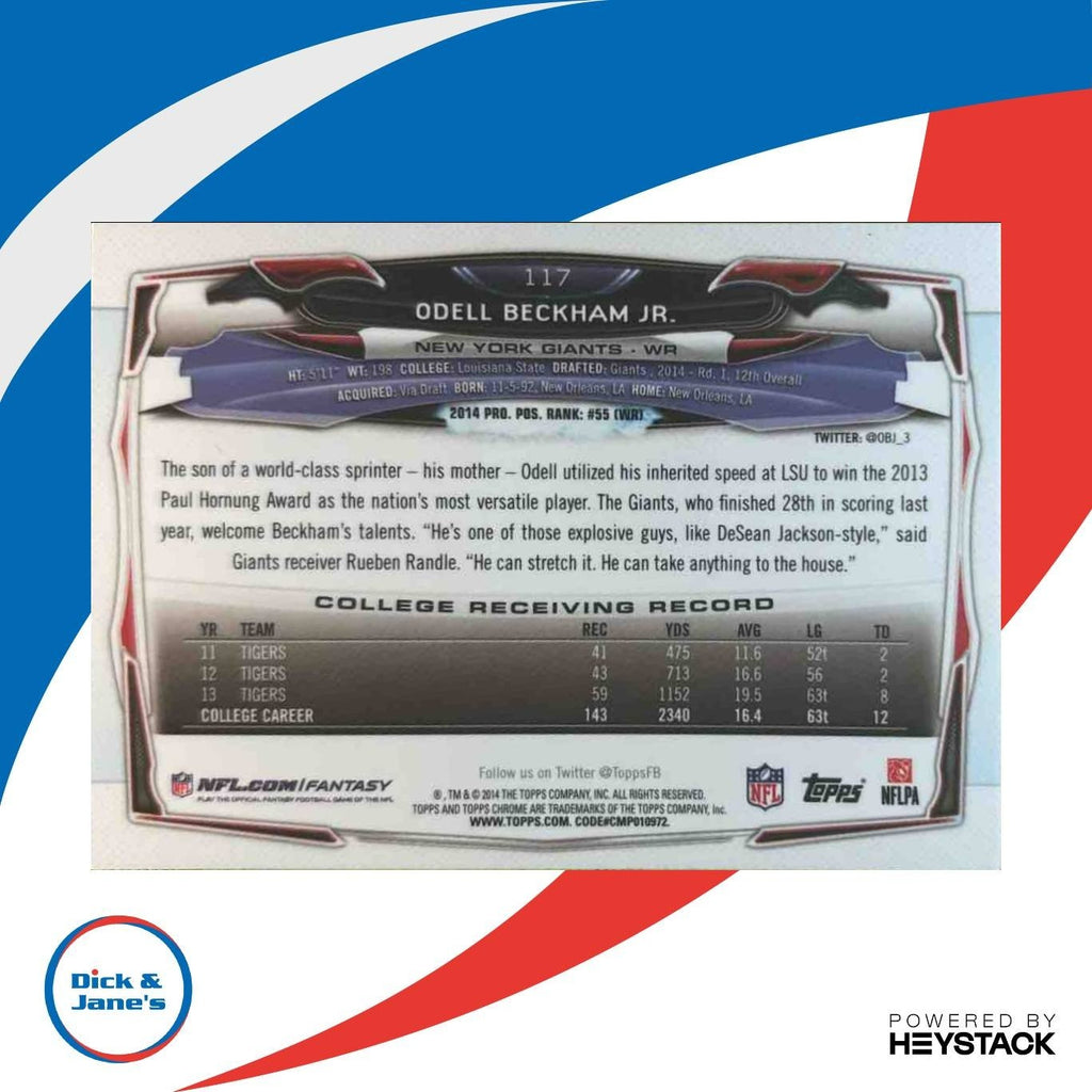 Own a piece of football history with this 2014 Topps Chrome Odell Beckham Jr. #117 RC New York Giants trading card. This rare rookie card features the talented wide receiver in his early career. A must-have for any NFL card collector or New York Giants fan! Listed With Mascot.