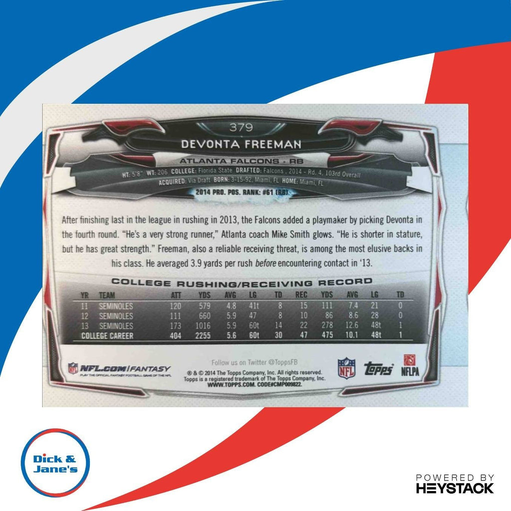 Collect the rookie card of NFL star Devonta Freeman with this 2014 Topps trading card! Featuring Freeman in his Atlanta Falcons uniform, this iconic card is a must-have for any sports card collector. Don't miss your chance to add this rare RC card to your collection! Listed With Mascot.