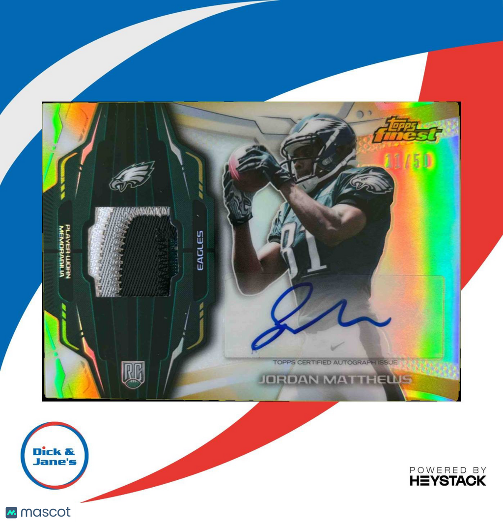 2014 Topps Finest Jordan Matthews Rookie Patch Auto Gold Refractor /50 Eagles Listed With Mascot.