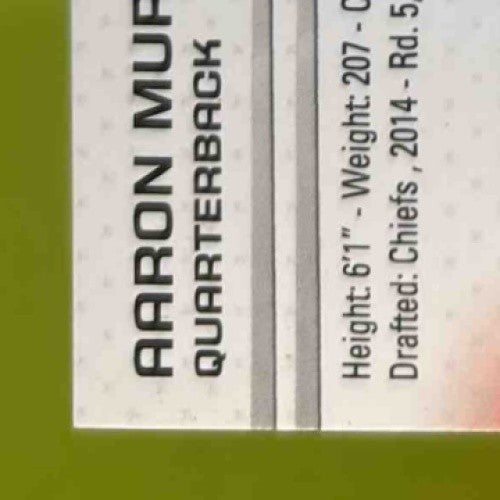 One-of-a-kind 2014 Topps Prime Aaron Murray Auto Relics Level 5 #PV-AU RC trading card featuring the talented Kansas City Chiefs quarterback. This rare NFL card showcases his autograph and a piece of his game-worn jersey, making it a must-have for any collector or football fan. Don't miss out on adding this unique piece to your collection! Listed With Mascot.