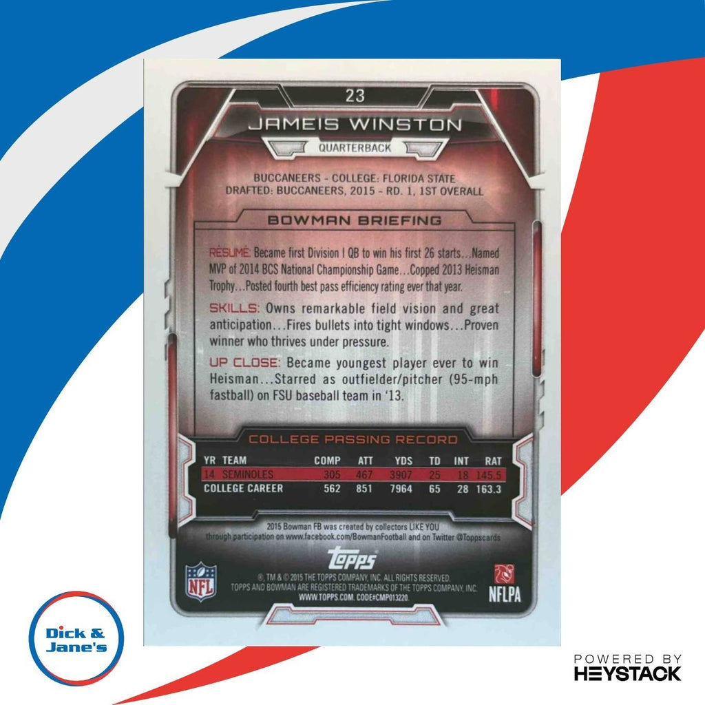 Get your hands on the 2015 Bowman Jameis Winston Rookies trading card featuring the quarterback of the Tampa Bay Buccaneers. This NFL rookie card is a must-have for any collector, showcasing Winston in action. Add this rare and valuable piece to your collection today! #NFL #Buccaneers #JameisWinston #TradingCard Listed With Mascot.