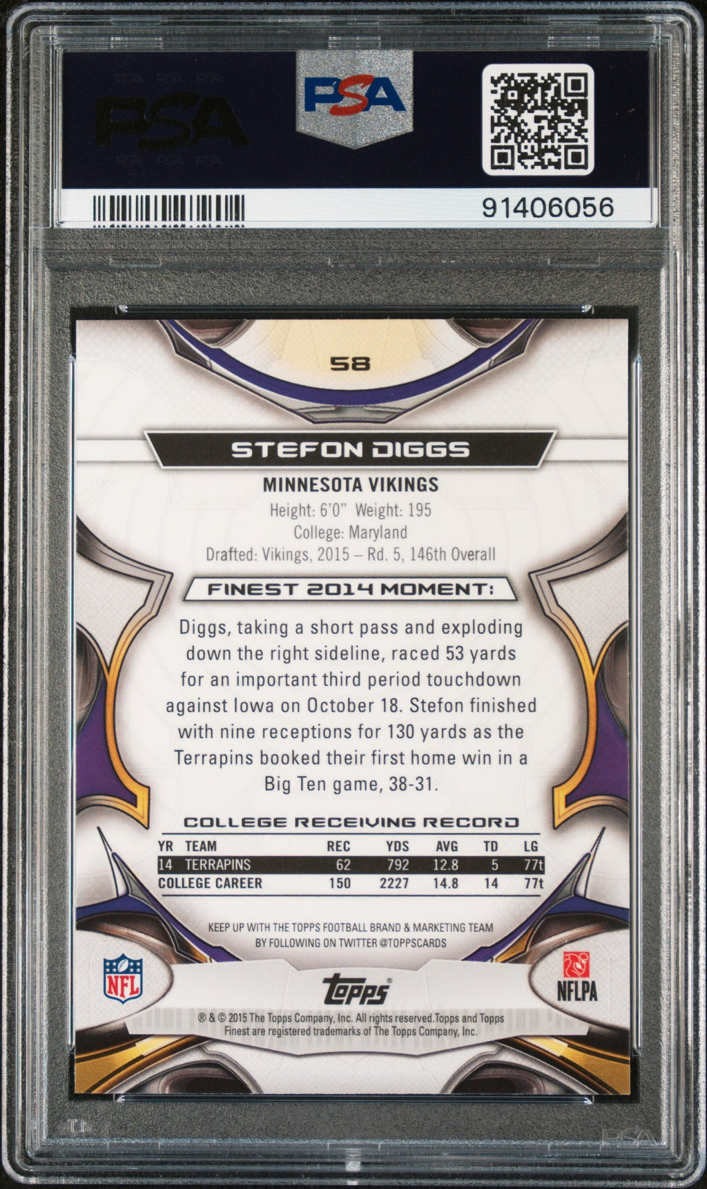 You are purchasing the following: 2015 Finest Stefon Diggs #58 PSA 10 . You will receive the exact item in the photographs. Note: Please do not connact us and asking the following: 1. What is the lowest you would take? Just make an offer. If the offer is automatically declined, you have your answer. 2. What the best you can do? See above. Not repling to an email is a reply. 3. Any room on this? See above. Not repling to an offer is a reply. 4. We ONLY do one counter offer, so please make your best offer the first time! Note: If the price off, in your option, please send your resaoning and an offer. We will review it. Note: We manage nearly 10 millon cards regularly and will adjust prices as errors are noticed or pointed out! Listed With Mascot.
