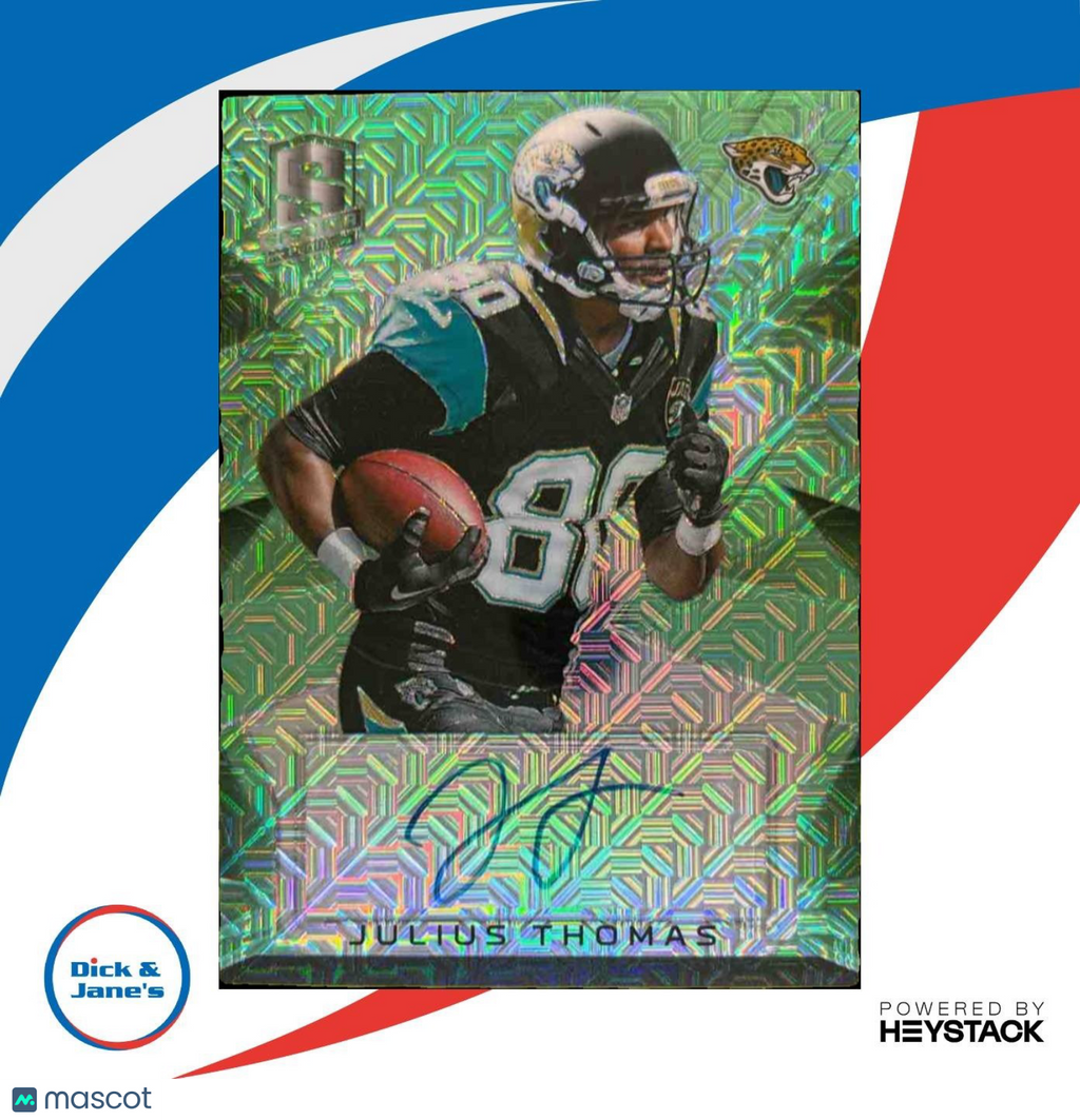 Own a piece of NFL history with the 2015 Panini Spectra Julius Thomas Signatures Neon Green trading card. This rare card features a vibrant autograph from the Jacksonville Jaguars player, numbered 8/25. Don't miss your chance to add this unique collectible to your sports memorabilia collection! Listed With Mascot.