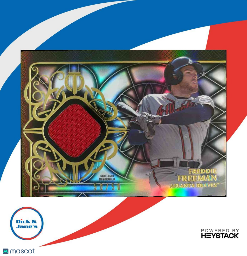This limited edition 2015 Topps Tribute Freddie Freeman Relics Black 50/50 #TR-FF trading card features a game-worn jersey relic from Atlanta Braves star player Freddie Freeman. With only 50 cards made, this rare collectible is a must-have for any MLB fan or card collector. Don't miss your chance to own a piece of baseball history! Listed With Mascot.