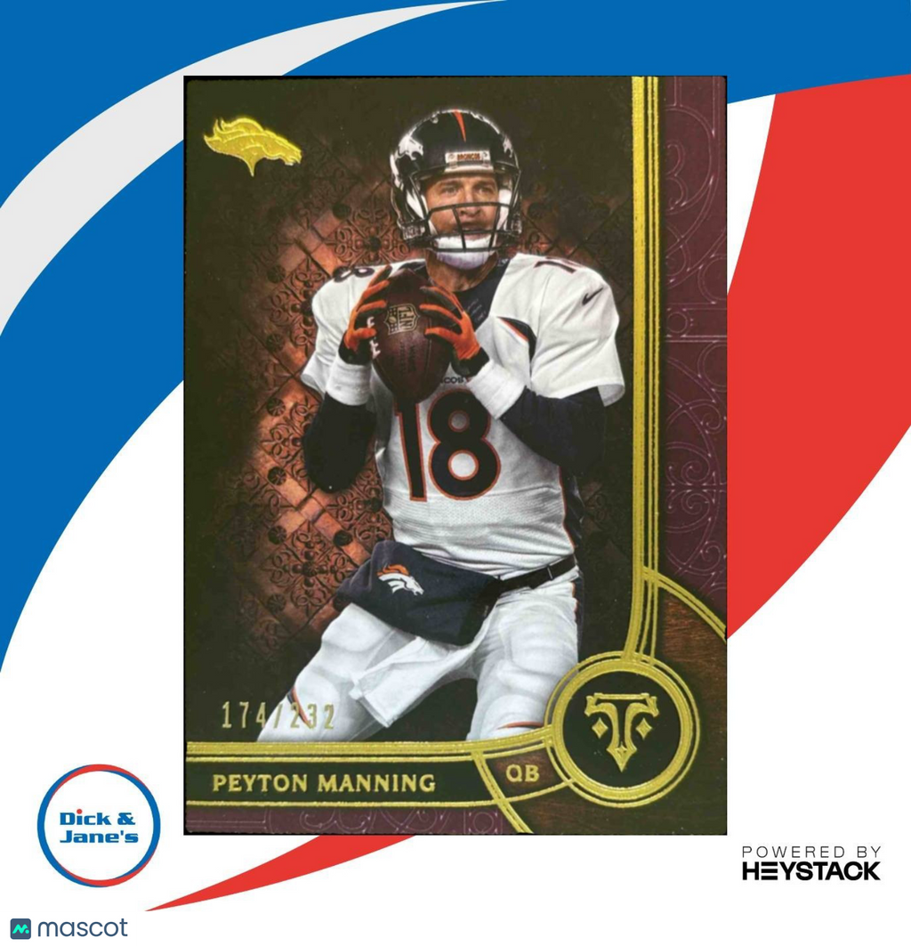 This rare 2015 Topps Triple Threads Peyton Manning Purple card is a must-have for any Denver Broncos or NFL collector. With only 232 made, this card is numbered 174/232 and features Manning in his iconic Broncos uniform. Add this gem to your collection today! Listed With Mascot.