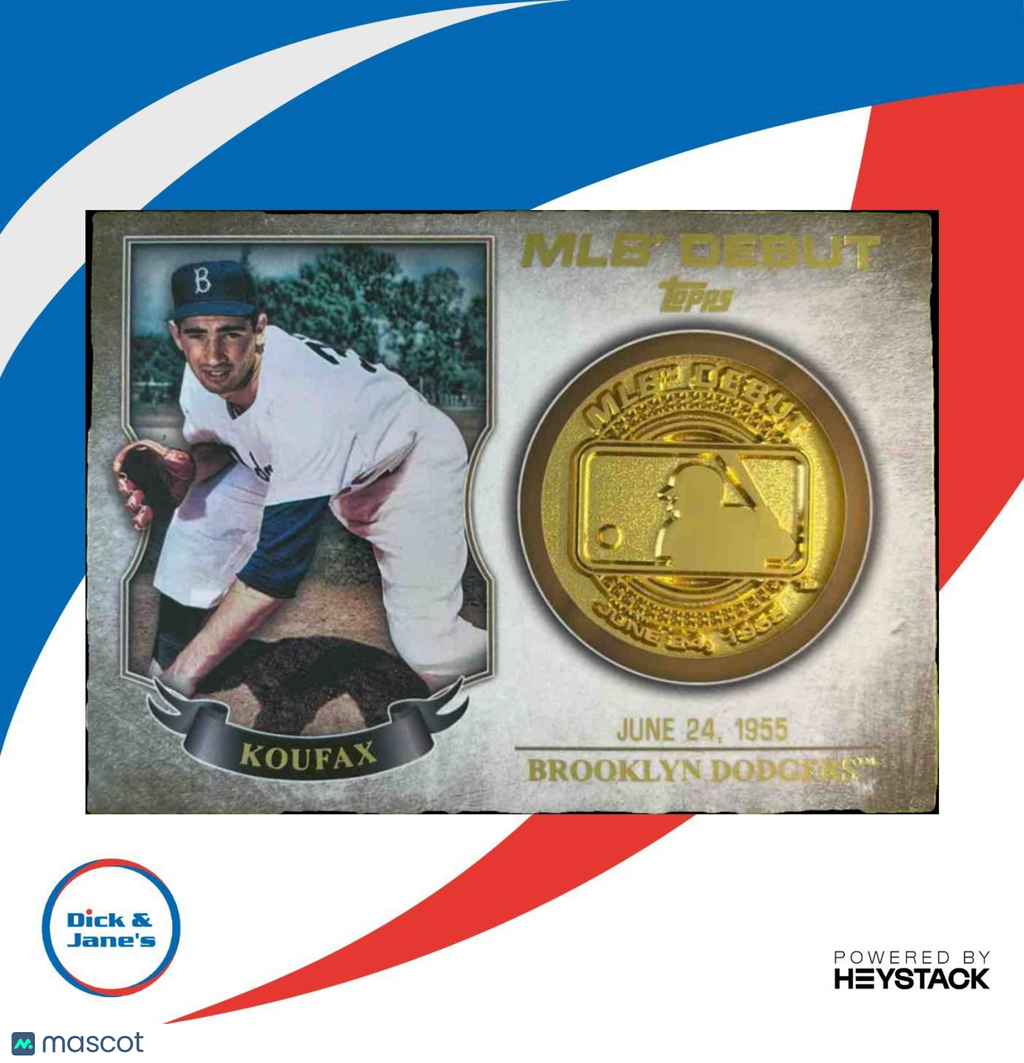 Own a piece of baseball history with the 2016 Topps Sandy Koufax MLB Debut Medallion Series 1 trading card. This card features the legendary Brooklyn Dodgers pitcher and is part of a limited edition medallion series. Perfect for any collector or baseball fan. Get it now and add it to your collection! Listed With Mascot.