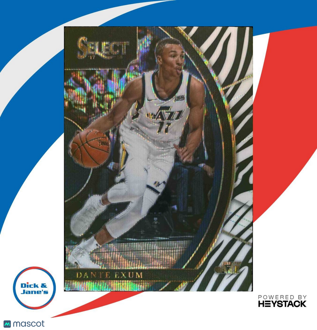 2017-18 Panini Select Dante Exum Zebra Prizms #29 Concourse Utah Jazz NBA trading card featuring a rare zebra pattern design. A must-have for Utah Jazz fans and basketball card collectors. Add this unique and valuable card to your collection today! Listed With Mascot.