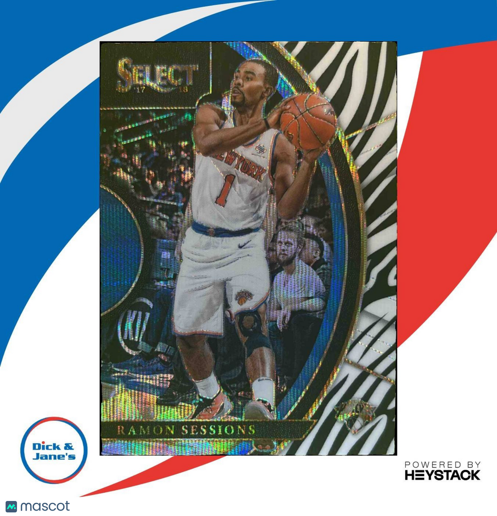 : This rare 2017-18 Panini Select Ramon Sessions Zebra Prizms #70 Concourse New York Knicks trading card is a must-have for any NBA fan. Featuring a unique zebra pattern design, this card is a standout piece for collectors. Add it to your collection today! Listed With Mascot.