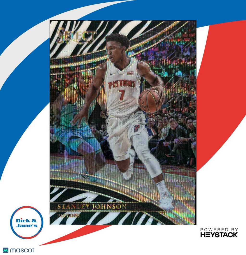 Own a piece of NBA history with this 2017-18 Panini Select Stanley Johnson Zebra Prizms #286 Courtside Pistons trading card! Featuring a rare zebra pattern, this card is perfect for any basketball card collector looking to add a unique and valuable item to their collection. Don't miss out on the chance to own this exclusive Courtside card. Listed With Mascot.