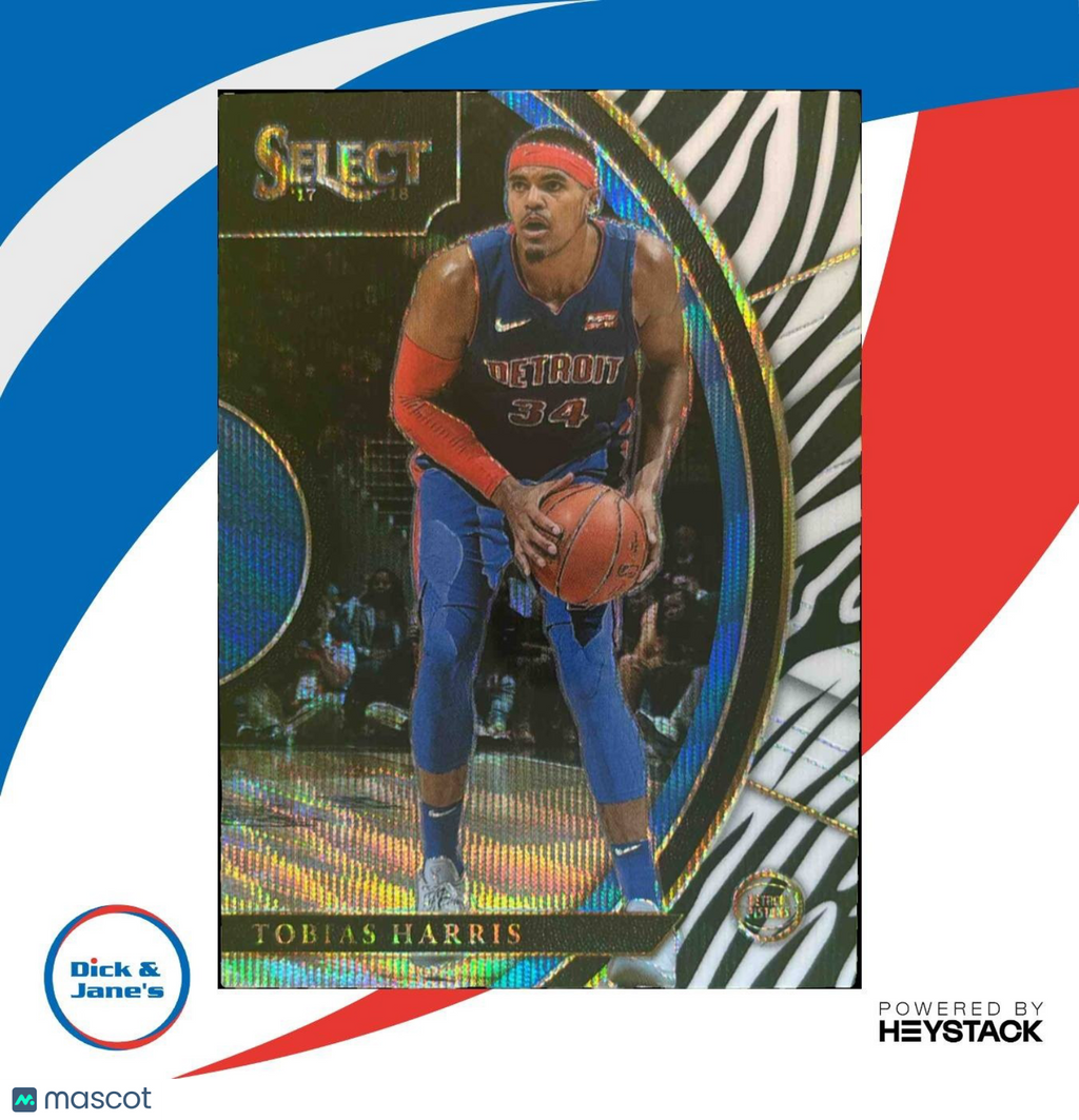 Get your hands on this rare 2017-18 Panini Select Tobias Harris Zebra Prizms #62 Concourse trading card featuring the Detroit Pistons star. Perfect for any NBA collector, this card is highly sought after for its unique design and player rarity. Add it to your collection today! Listed With Mascot.