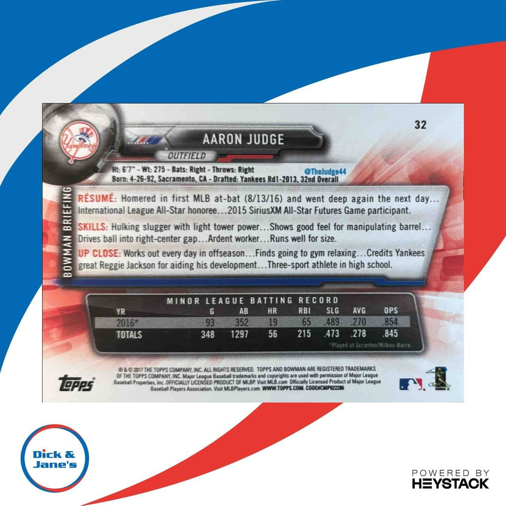 Own a piece of baseball history with this 2017 Bowman Aaron Judge #32 RC trading card featuring the New York Yankees rookie star. This must-have card showcases Judge's rookie season and is a must-have for any baseball card collector or Yankees fan. Add this rare and valuable card to your collection today! Listed With Mascot.
