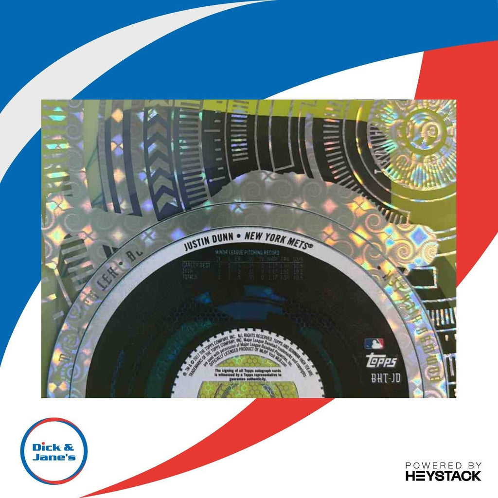 This 2017 Bowman High Tek Justin Dunn card features a rare Pattern 4 Circuit Board design, showcasing the New York Mets pitcher in stunning detail. A must-have for any baseball card collector, this limited edition card is sure to be a standout in your collection. Don't miss your chance to own a piece of MLB history with this unique and eye-catching trading card. Listed With Mascot.