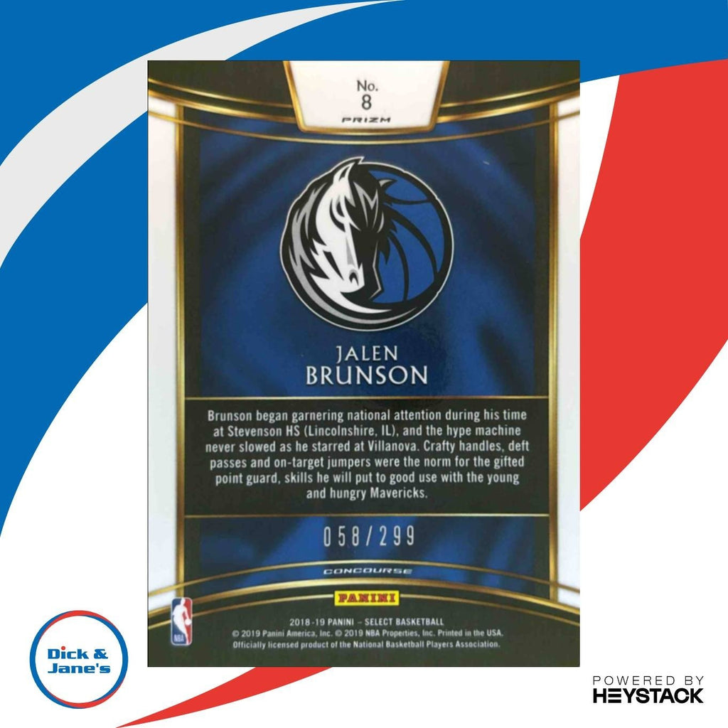 Own a piece of NBA history with this 2018-19 Panini Select Jalen Brunson Light Blue Prizms trading card. Numbered 58/299, this RC Concourse card features the Mavericks rookie in stunning detail. Add this rare collectible to your basketball card collection today! Listed With Mascot.