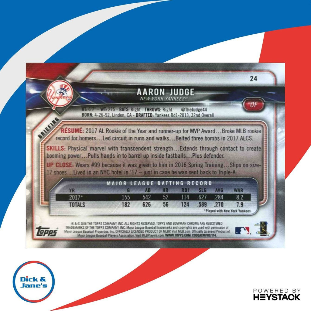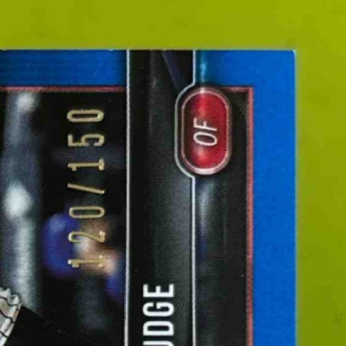 Rare 2018 Bowman Aaron Judge Blue parallel trading card, limited to only 150 made. Features a stunning image of the New York Yankees star outfielder. A must-have for any baseball card collector or Aaron Judge fan. Don't miss out on adding this exclusive MLB card to your collection! Listed With Mascot.