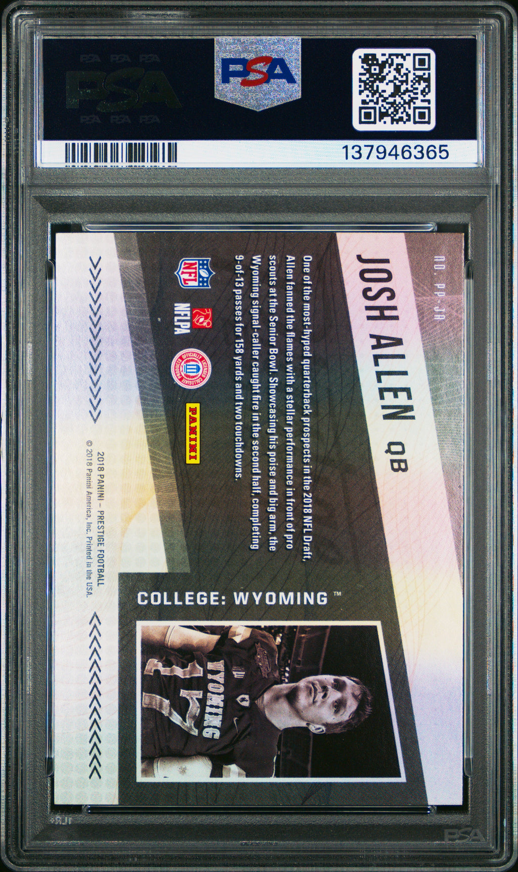 2018 Panini Prestige NFL Passport Josh Allen #PPJA PSA 9 MINT Buffalo Bills Don’t miss your chance to own this highly sought-after 2018 Panini Prestige NFL Passport Josh Allen rookie card, graded PSA 9 MINT! As one of only 173 in the population with just 122 graded higher, this card is a standout addition for any Buffalo Bills or Josh Allen fan. Professionally authenticated by PSA, this card showcases Allen’s early career and is a must-have for collectors looking to invest in one of football’s top quarterbacks. This card comes with a unique certification number (137946365) and features the official NFL Passport design from Panini. Whether you’re building your collection or searching for the perfect gift for a Bills supporter, this rare gem is sure to impress. Secure this premium collectible today before it’s gone! Graded: Yes Sport: Football Population Higher: 122 Set: 2018 Panini Prestige NFL Passport Certification Number: 137946365 Grader: Professional Sports Authenticator (PSA) Manufacturer: Panini Population: 173 Team: Buffalo Bills Grade: 9 Player/Athlete: Josh Allen Year Manufactured: 2018 Card Number: PPJA Listed With Mascot.