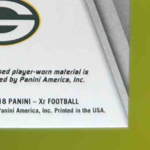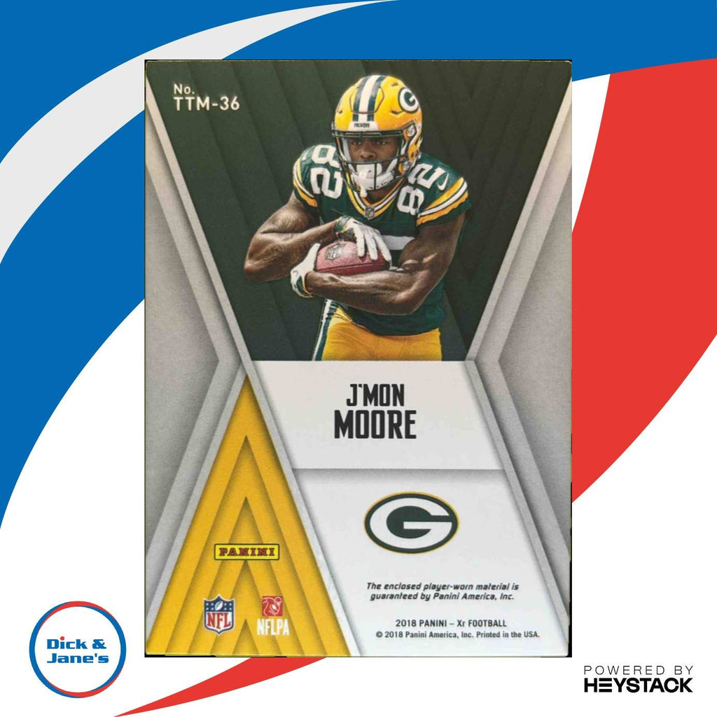 Own a piece of NFL history with this 2018 Panini XR J Mon Moore Rookie Triple Threats Materials Orange trading card featuring an authentic memorabilia relic from the Green Bay Packers rookie. Limited edition, numbered 24/25. Add this rare collectible to your sports card collection today! Listed With Mascot.