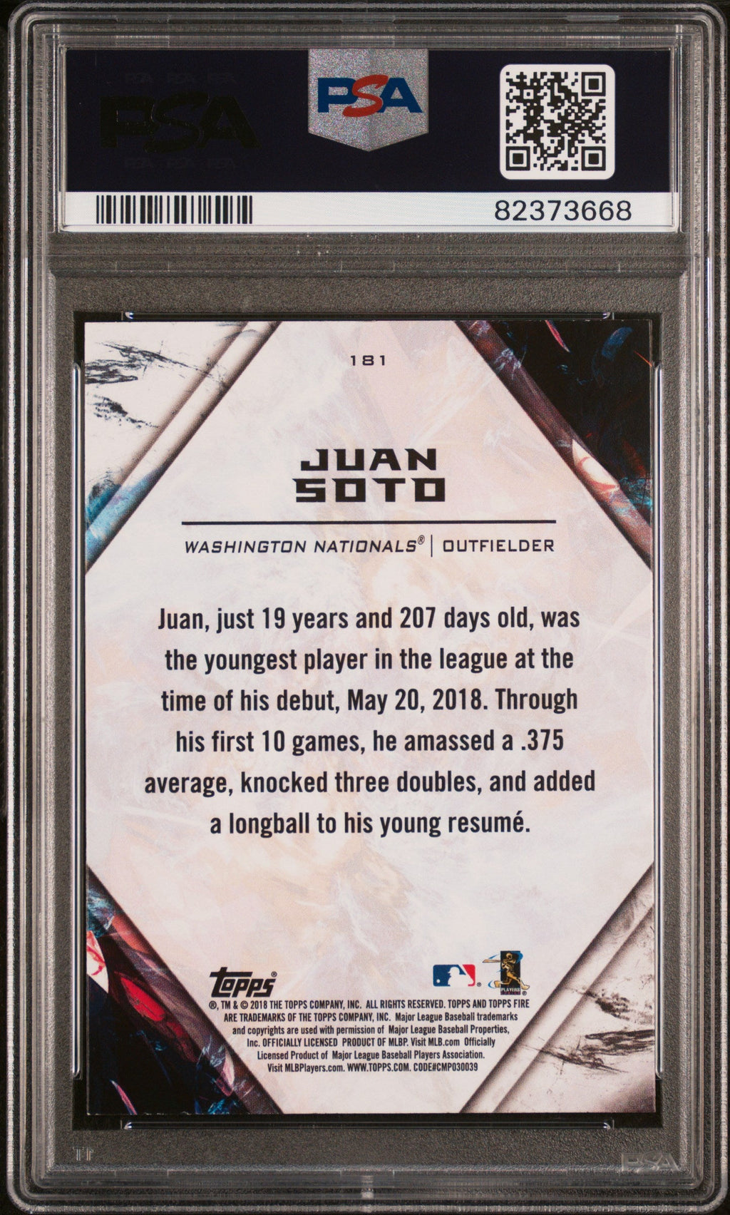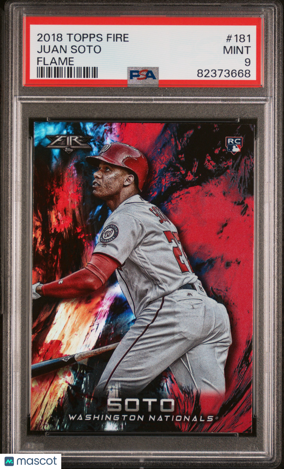 You are purchasing the following: 2018 Topps Fire Juan Soto Flame Rookie #181 PSA 9 Washington Nationals. You will receive the exact item in the photographs. Note: Please do not connact us and asking the following: 1. What is the lowest you would take? Just make an offer. If the offer is automatically declined, you have your answer. 2. What the best you can do? See above. Not repling to an email is a reply. 3. Any room on this? See above. Not repling to an offer is a reply. 4. We ONLY do one counter offer, so please make your best offer the first time! Note: If the price off, in your option, please send your resaoning and an offer. We will review it. Note: We manage nearly 10 millon cards regularly and will adjust prices as errors are noticed or pointed out! Listed With Mascot.