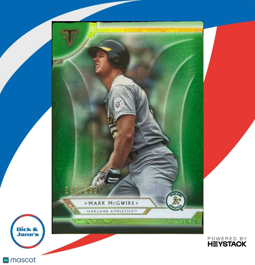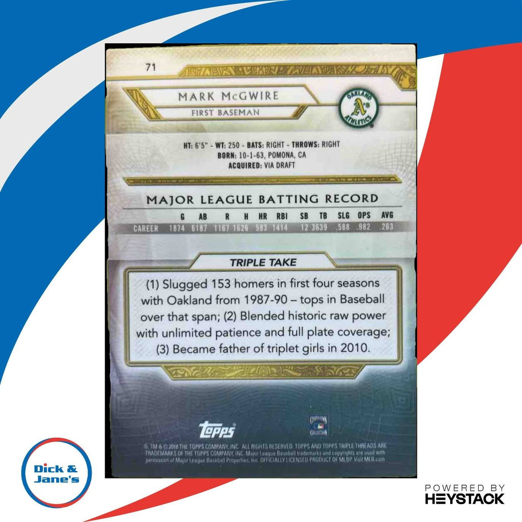 For sale: 2018 Topps Triple Threads Mark McGwire Emerald 146/259 #71 Oakland Athletics MLB trading card. This rare and collectible card showcases legendary player Mark McGwire in his Oakland Athletics uniform. Don't miss out on adding this gem to your collection. #sports #collectibles #MLB #tradingcard Listed With Mascot.