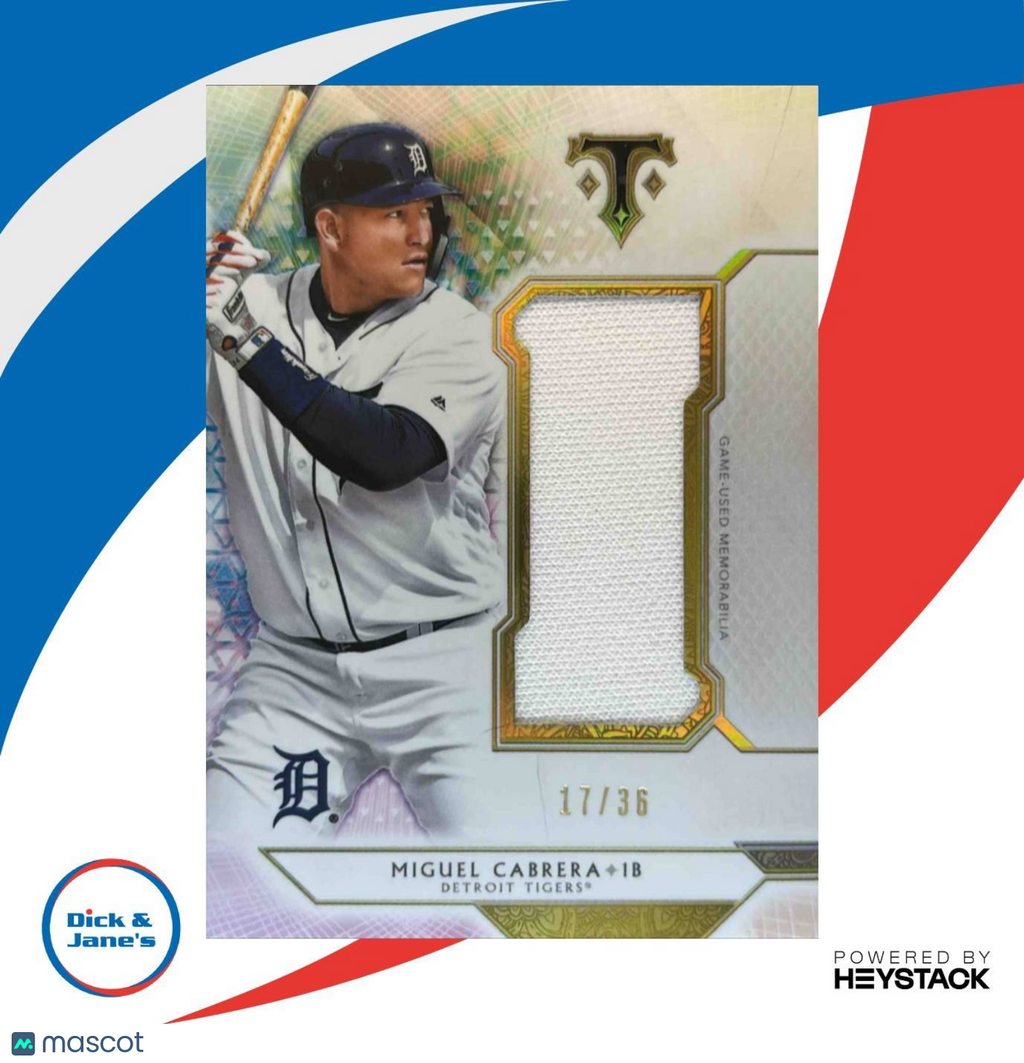 Own a piece of baseball history with this 2018 Topps Triple Threads Miguel Cabrera Single Jumbo Relics card. Featuring a game-worn jersey relic from the Detroit Tigers superstar, this limited edition card is numbered out of 36. Perfect for any collector or fan of Cabrera and the Tigers. Add this rare card to your collection today! Listed With Mascot.