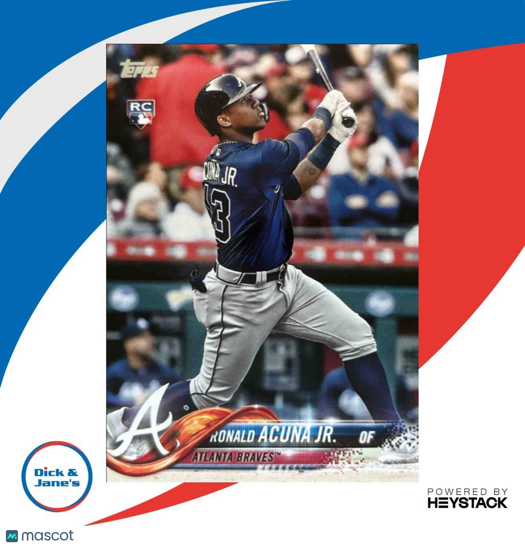 Get your hands on this rare 2018 Topps Update Ronald Acuna Jr. rookie card featuring the Atlanta Braves player. A must-have for any MLB card collector, this card is in mint condition and highly sought after. Don't miss your chance to own a piece of baseball history! Listed With Mascot.