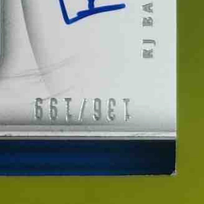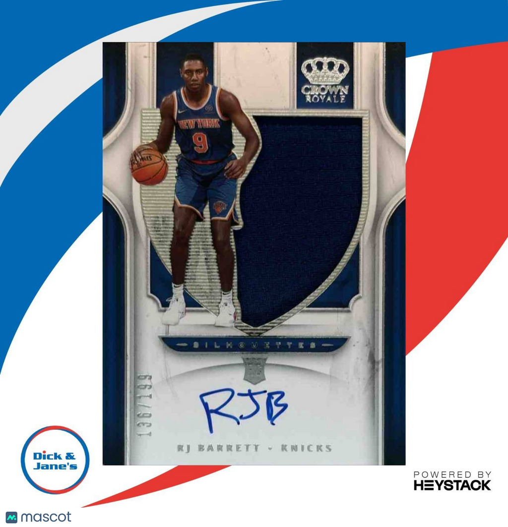 This rare 2019-20 Panini Crown Royale RJ Barrett rookie card features an autograph and is numbered 136/199. A must-have for any New York Knicks or basketball card collector. Don't miss your chance to own this exclusive piece of NBA memorabilia! Listed With Mascot.