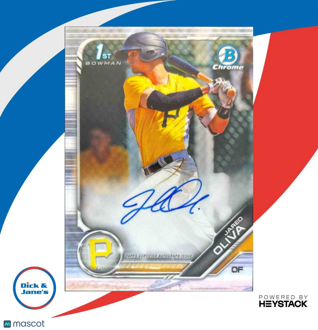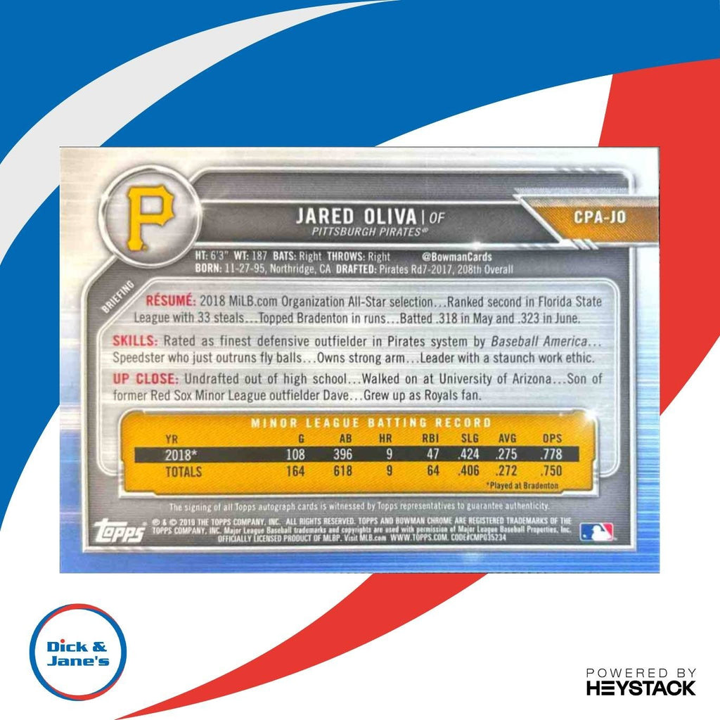 Own a piece of baseball history with this rare 2019 Bowman Chrome Jared Oliva Auto trading card. Featuring the Pittsburgh Pirates top prospect, this card is a must-have for any collector. Don't miss your chance to add this 1st Prospect Auto card to your collection today! Listed With Mascot.