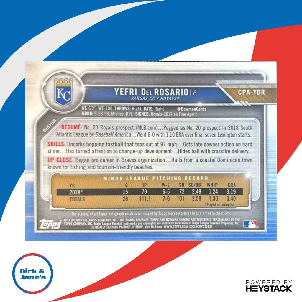 Add the coveted 2019 Bowman Chrome Yefri Del Rosario Auto 1st Prospect trading card to your collection! This MLB card features an authentic autograph, marking Del Rosario's debut as a top prospect for the Kansas City Royals. A must-have for any trading card enthusiast and baseball fan. Listed With Mascot.