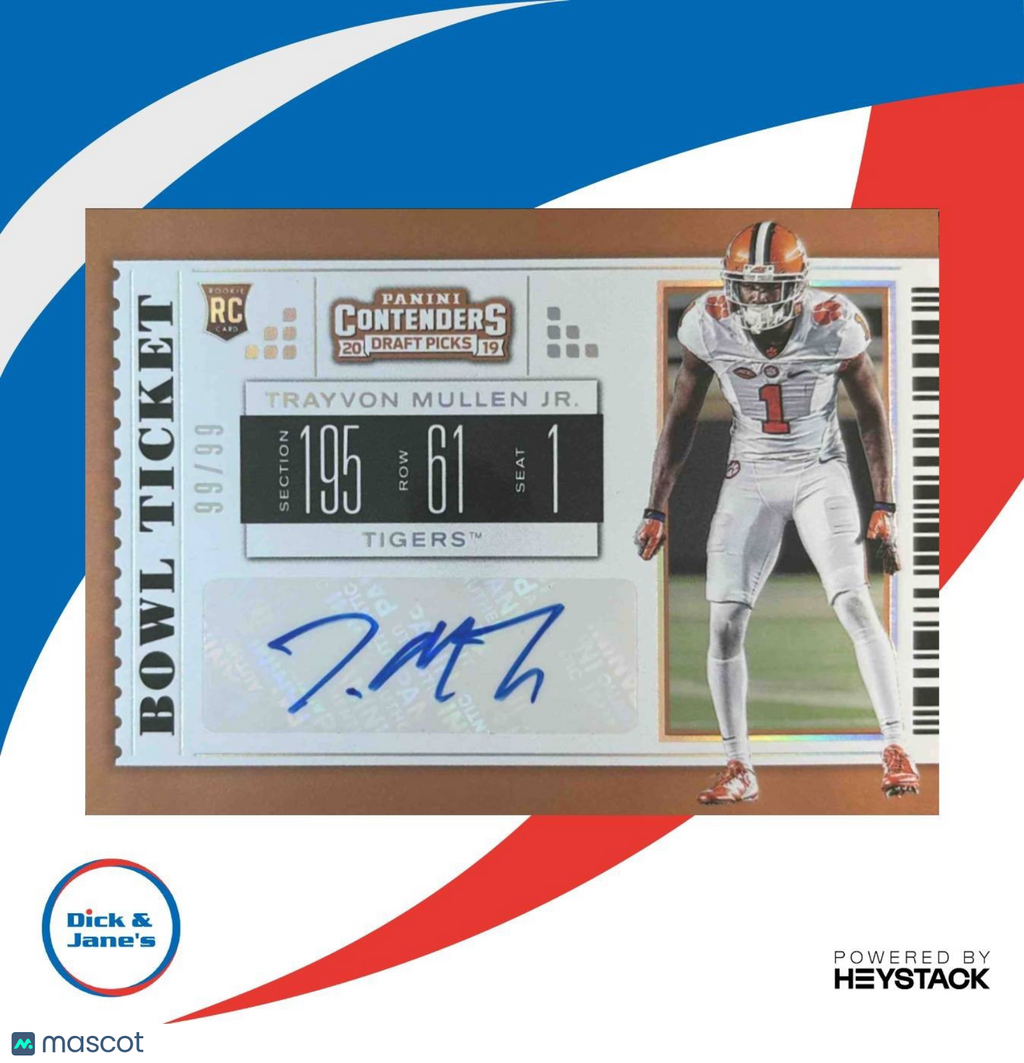 The 2019 Contenders College Trayvon Mullen Jr. Bowl Ticket #225 RC Auto Clemson trading card is a must-have for any NCAAF fan. Limited edition to only 99 made, this rare rookie card features Mullen's autograph from his college days at Clemson. Don't miss out on adding this collectible to your sports card collection! #tradingcard #NCAAF #collectible Listed With Mascot.
