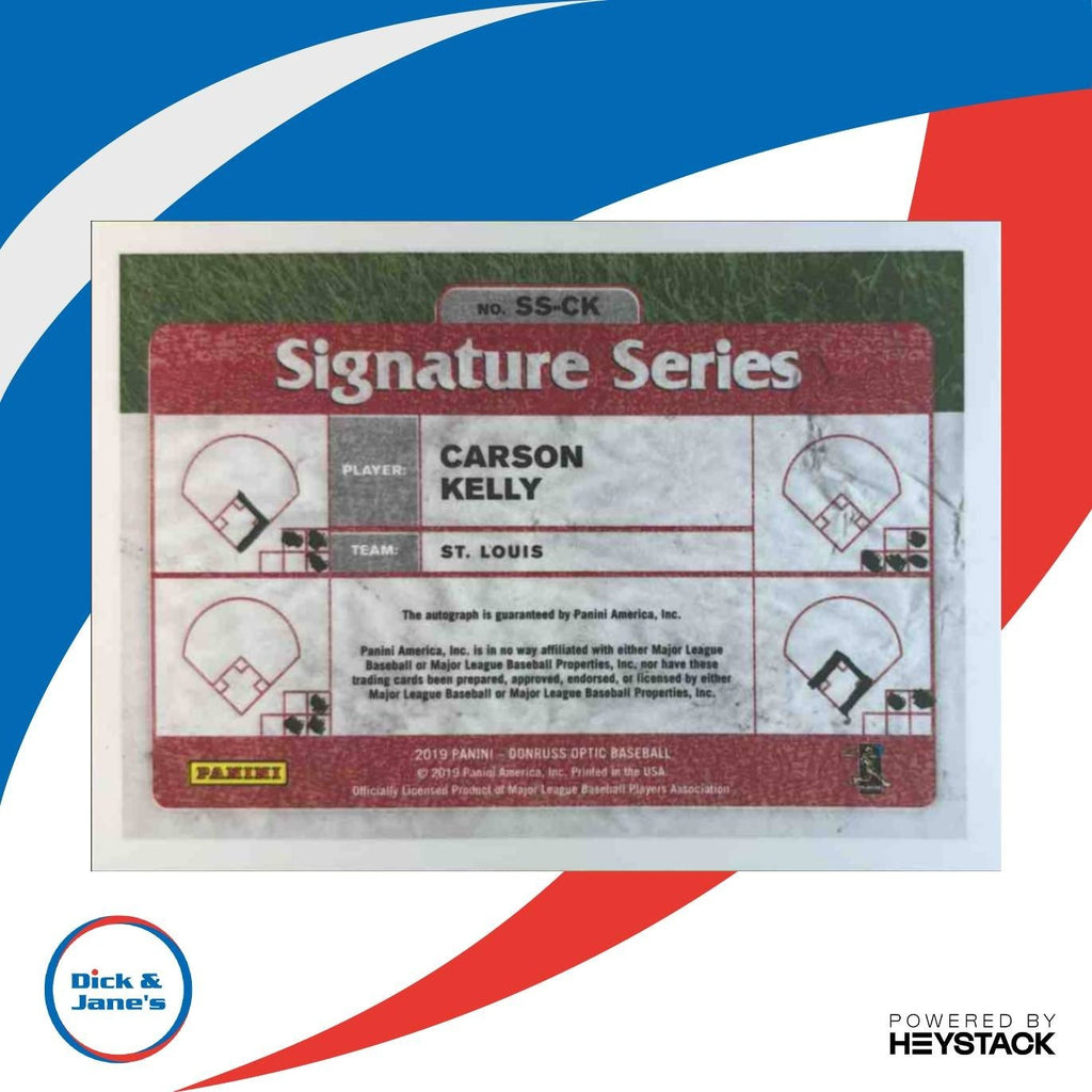 Own a piece of MLB history with the 2019 Donruss Optic Carson Kelly Signature Series #SS-CK Auto trading card. This autographed card features the St. Louis Cardinals player in stunning detail. Perfect for fans and collectors alike, don't miss out on adding this rare gem to your collection. Listed With Mascot.