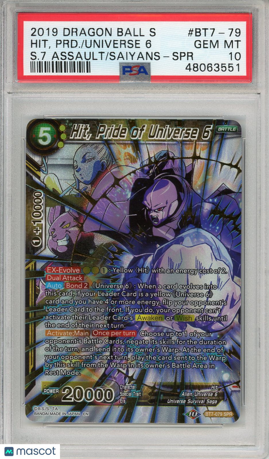 You are purchasing a 2019 Dragon Ball Super Card Game Series 7 Assault Of The Saiyans Hit,Pride #BT7-079 Serbian S.7 Assault/Saiyans-SPR PSA 10. You will receive the exact item in the photographs. Thank you for looking. Listed With Mascot.