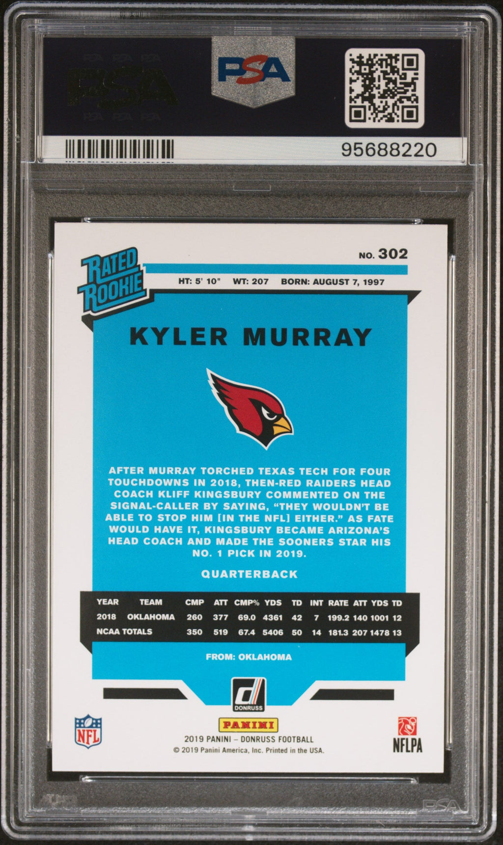 You are purchasing the following: 2019 Panini Donruss Kyler Murray #302 PSA 10 . You will receive the exact item in the photographs. Note: Please do not connact us and asking the following: 1. What is the lowest you would take? Just make an offer. If the offer is automatically declined, you have your answer. 2. What the best you can do? See above. Not repling to an email is a reply. 3. Any room on this? See above. Not repling to an offer is a reply. 4. We ONLY do one counter offer, so please make your best offer the first time! Note: If the price off, in your option, please send your resaoning and an offer. We will review it. Note: We manage nearly 10 millon cards regularly and will adjust prices as errors are noticed or pointed out! Listed With Mascot.