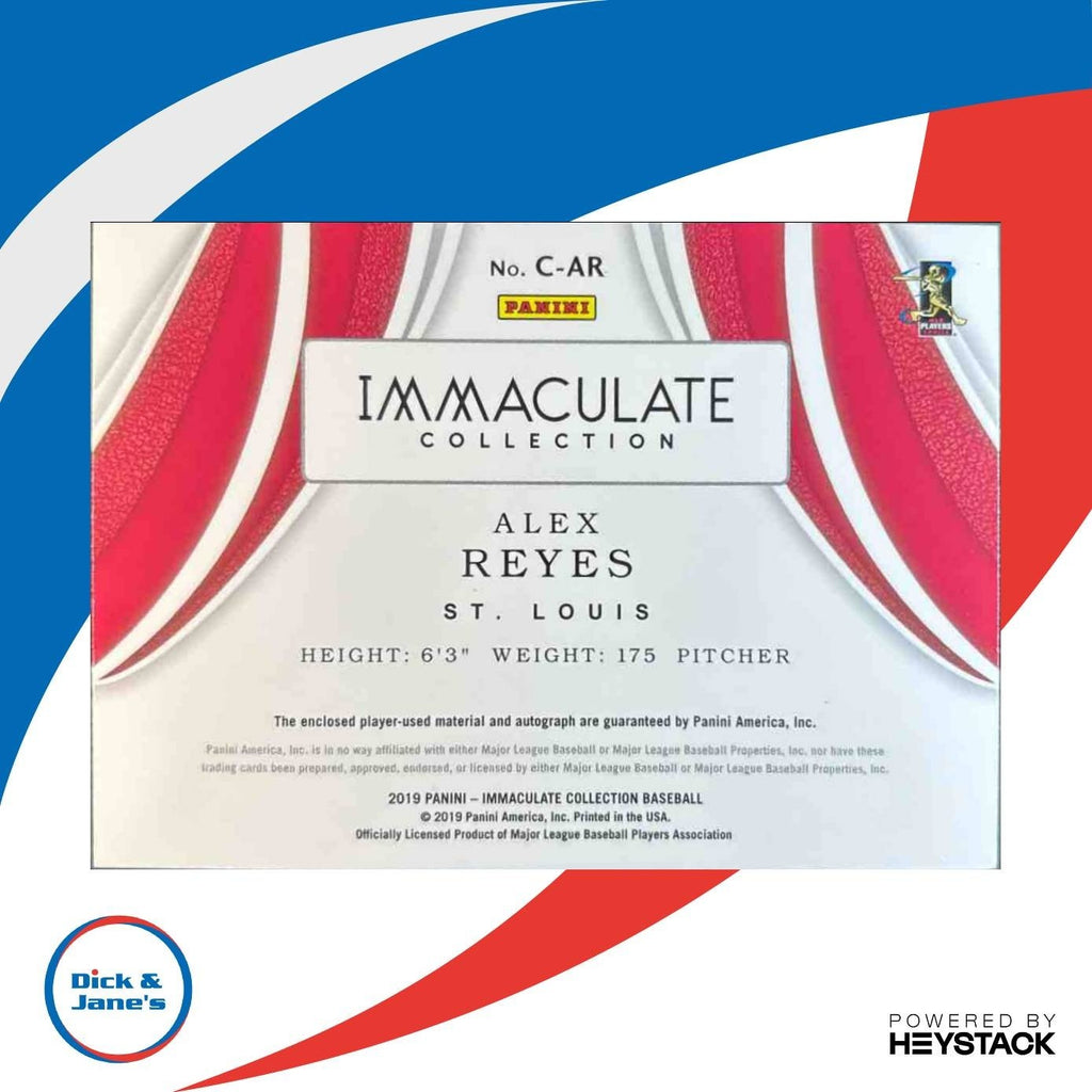 This 2019 Panini Immaculate Collection Alex Reyes card is a must-have for any St. Louis Cardinals fan! Complete with a piece of game-worn jersey, this rare card is numbered 3 out of 25. Add this valuable and unique MLB collectible to your collection today. Listed With Mascot.