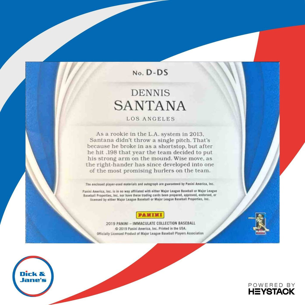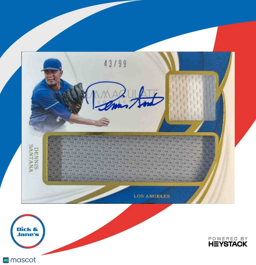 Collect this rare and exclusive 2019 Panini Immaculate Collection Dennis Santana trading card featuring a game-worn memorabilia and autograph from the Los Angeles Dodgers rookie pitcher. Limited to only 99 copies, this rookie card is a must-have for any MLB fan or collector. Add this unique piece to your collection today! Listed With Mascot.