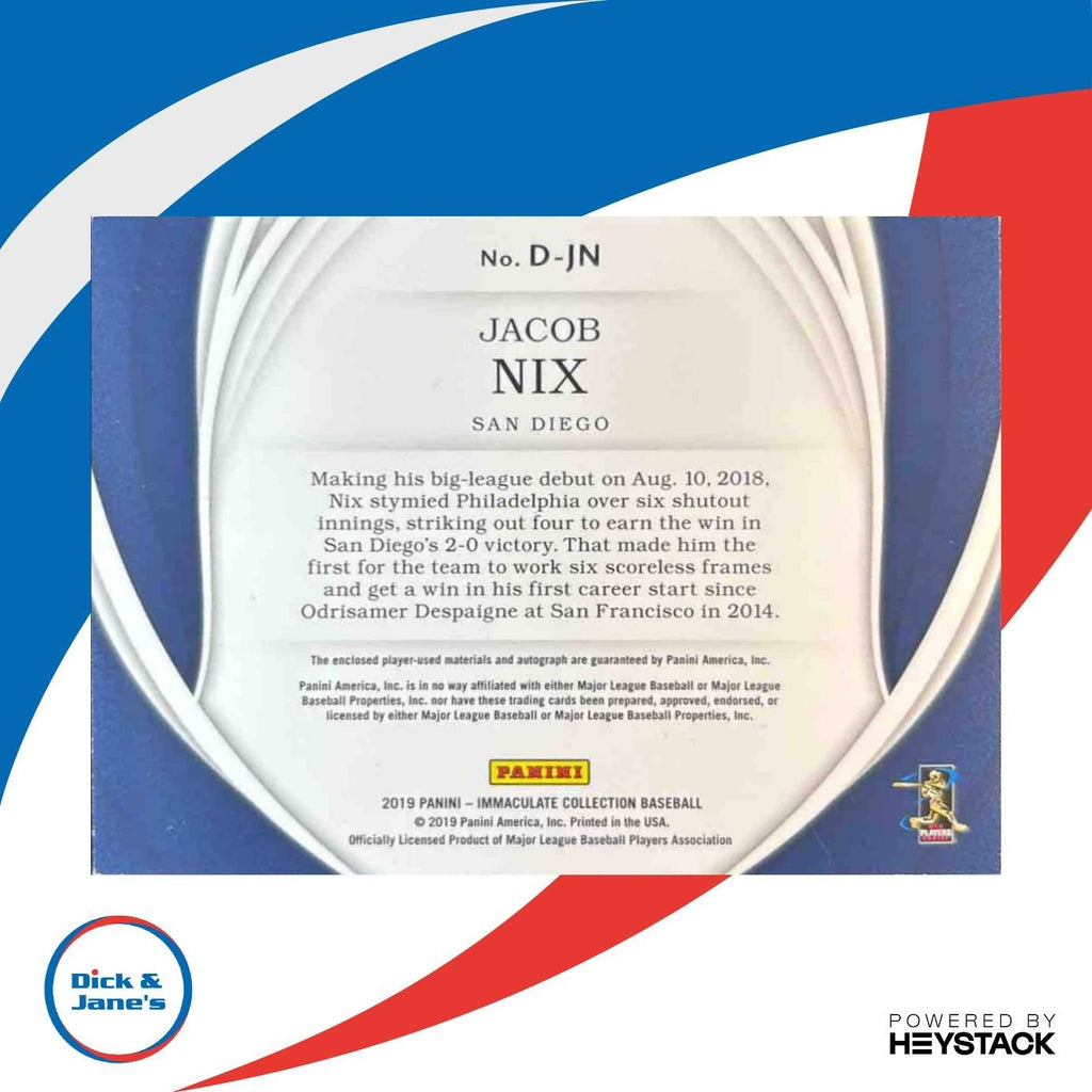 Collect the 2019 Panini Immaculate Collection Jacob Nix baseball trading card featuring a rare Doubles /99 Memorabilia Rookie Card with an autograph from his time playing for the San Diego Padres. This highly sought-after card is perfect for any MLB trading card collector looking to add a unique and valuable piece to their collection. Grab it now before it's gone! Listed With Mascot.