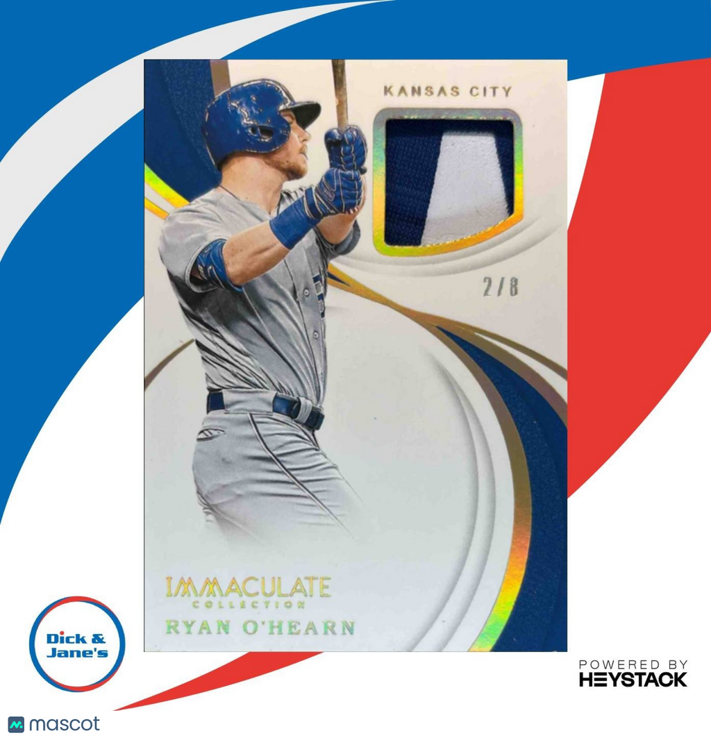 This rare 2019 Panini Immaculate Swatches trading card features a game-worn jersey swatch and autograph of Ryan O'Hearn from the Kansas City Royals. Limited to only 8 cards in existence, this rookie card is a must-have for any MLB memorabilia collector. Get it now before it's gone! Listed With Mascot.