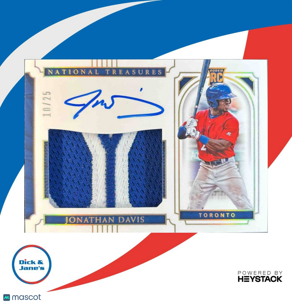This rare 2019 Panini National Treasures trading card features rising star Jonathan Davis of the Toronto Blue Jays. Limited to only 25 copies, this card includes a certified autograph, player-worn memorabilia, and is classified as a rookie card. A must-have for any serious collector or Blue Jays fan. Listed With Mascot.