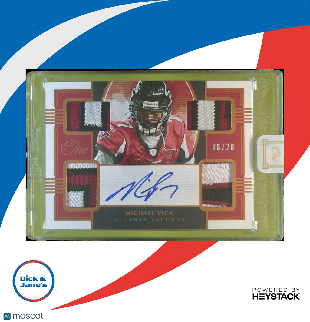 Own a piece of NFL history with this 2019 Panini One Michael Vick Quad Patch Auto /20 MEM Auto trading card. Featuring authentic memorabilia and a rare autograph from the Atlanta Falcons legend, this card is a must-have for any football fan or collector. Don't miss out on this unique and valuable piece of sports memorabilia. Listed With Mascot.